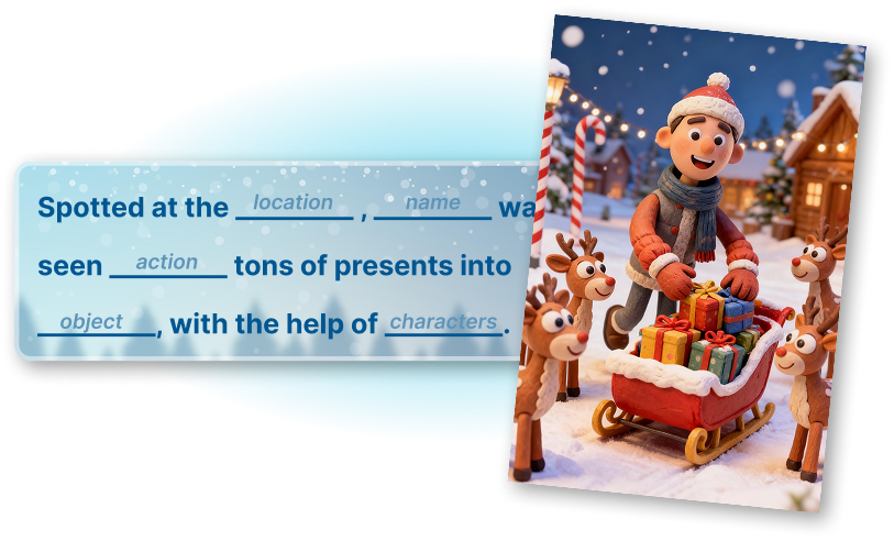This concept uses our AI Stories Experience and works like a digital version of "Mad Libs" for a fantastic office holiday party idea for creative teams. You design a custom fill-in-the-blank story that allows each user to create a personalized scene.