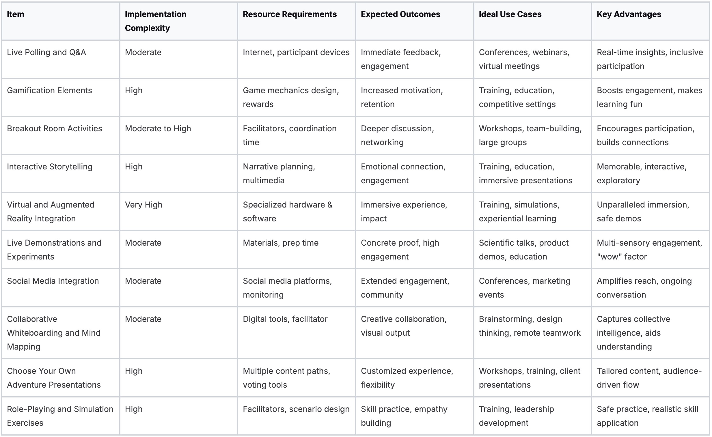 Interactive Presentation Ideas Comparison Matrix