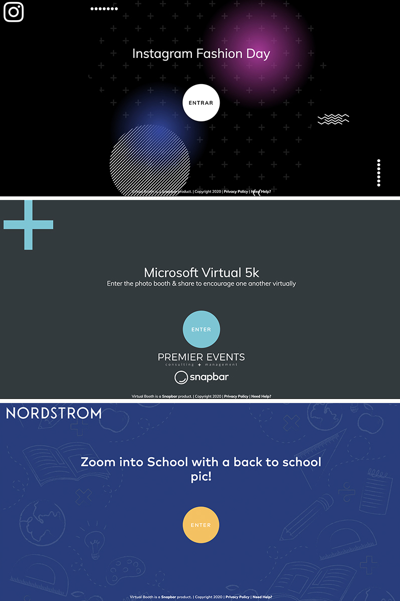 Check out these five unique start screens, companies designed for their Snapshot -- from back-to-school sales and private media events, to virtual 5ks and professional sporting events, Virtual Booth can be used for a variety of concepts.