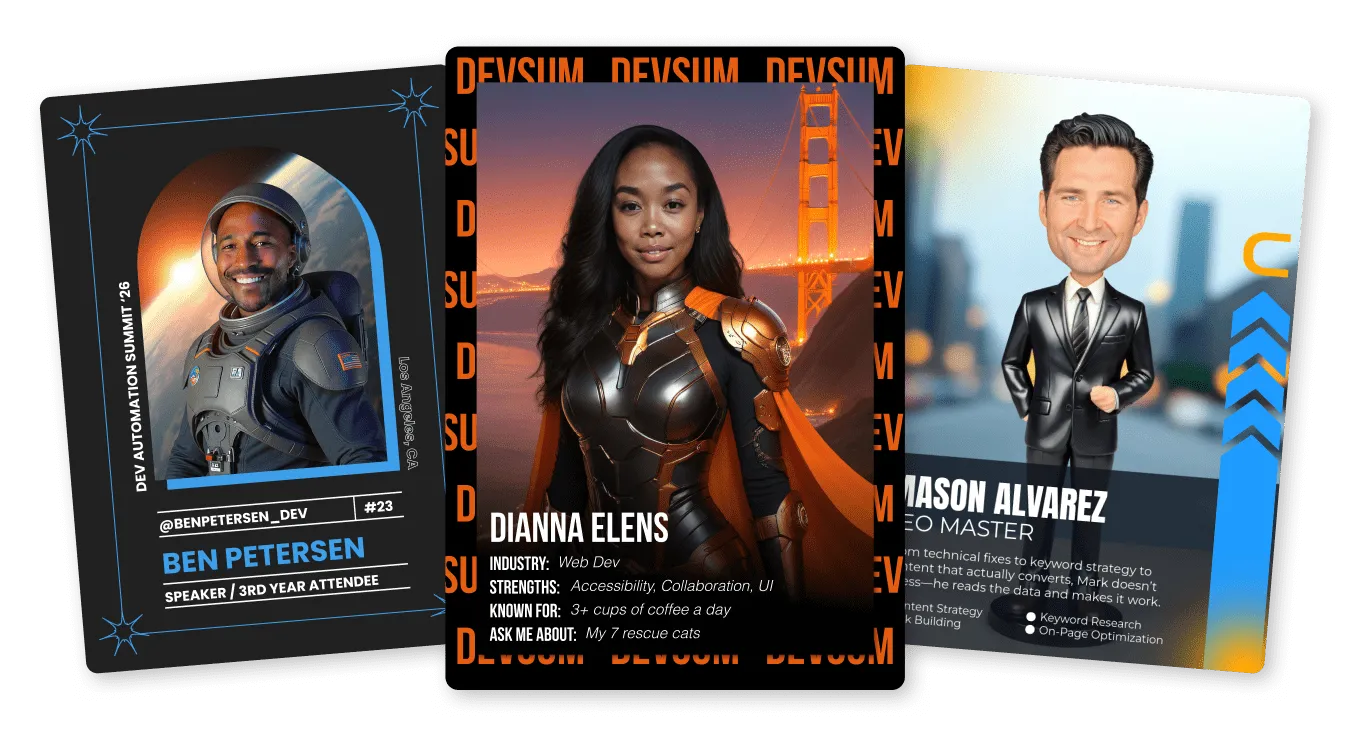 AI-generated trading cards feature attendees as the stars with team designs, or even rarity overlays based on built-in logic. Perfect for sharing digitally or as prints.